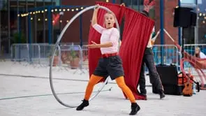 Deux amis, deux frères, … deux hommes occupent leur espace. Ils sont chez eux, ils sont dans un jardin, un parc, un terrain vague, une forêt. Ils flânent et s’occupent posément. Puis naît le plaisir de jouer et de se mettre au défi. Des morceaux de pommes volent dans les airs pour arriver dans la bouche d’un guitariste Funky aux notes rebelles. L’enthousiasme et un souffle créatif poussent les défis crescendo, et les haches entrent en scène. Elles tournent et sont manipulées en équilibres instables au tempo d’un beat box-harmonica tumultueux. Poussant la malice et allant toujours plus loin dans leur délire, l’un d’eux se transforme une cible. Les haches volent alors et s’abattent dans un ballet délirant, aérien et vertigineux.